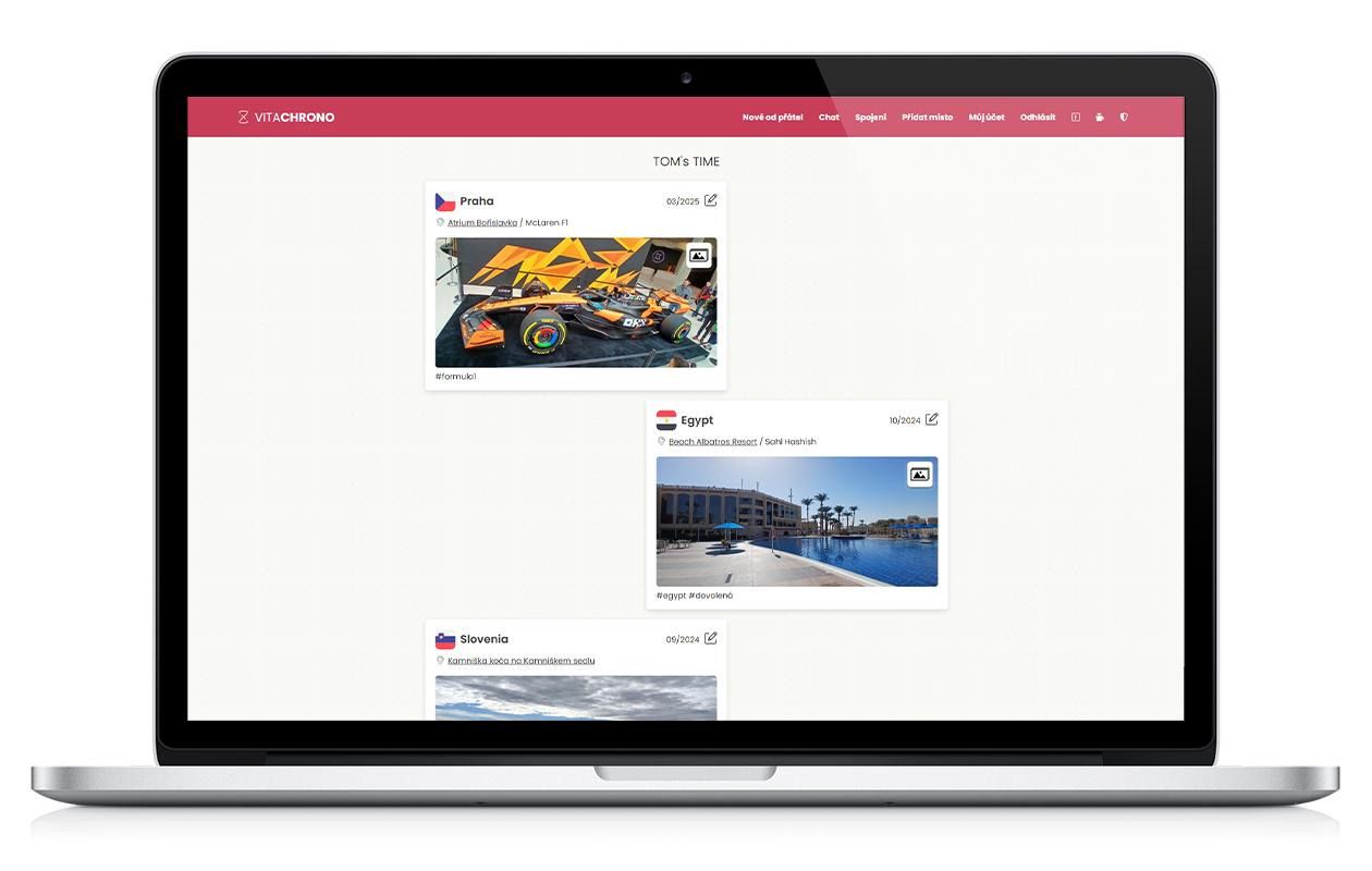 VitaChrono je minimalistická platforma pro sdílení zážitků bez algoritmického balastu. Data jsou vaše, vztahy jsou oboustranné a vše zůstává mimo dohled korporací.